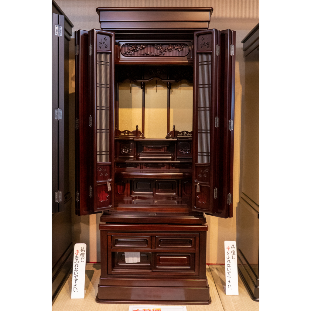 商品名紫檀系 清里 18号メーカー森正(徳島県)価格1,128,600円(税込み)本体寸法高161cm×幅62cm×奥行58cm仏間寸法3尺仏間ポイントプラスチックは使用していません。総木製です。紫壇系(グラナディロ)です。彫刻はてっせんとからくさがモチーフです。... -