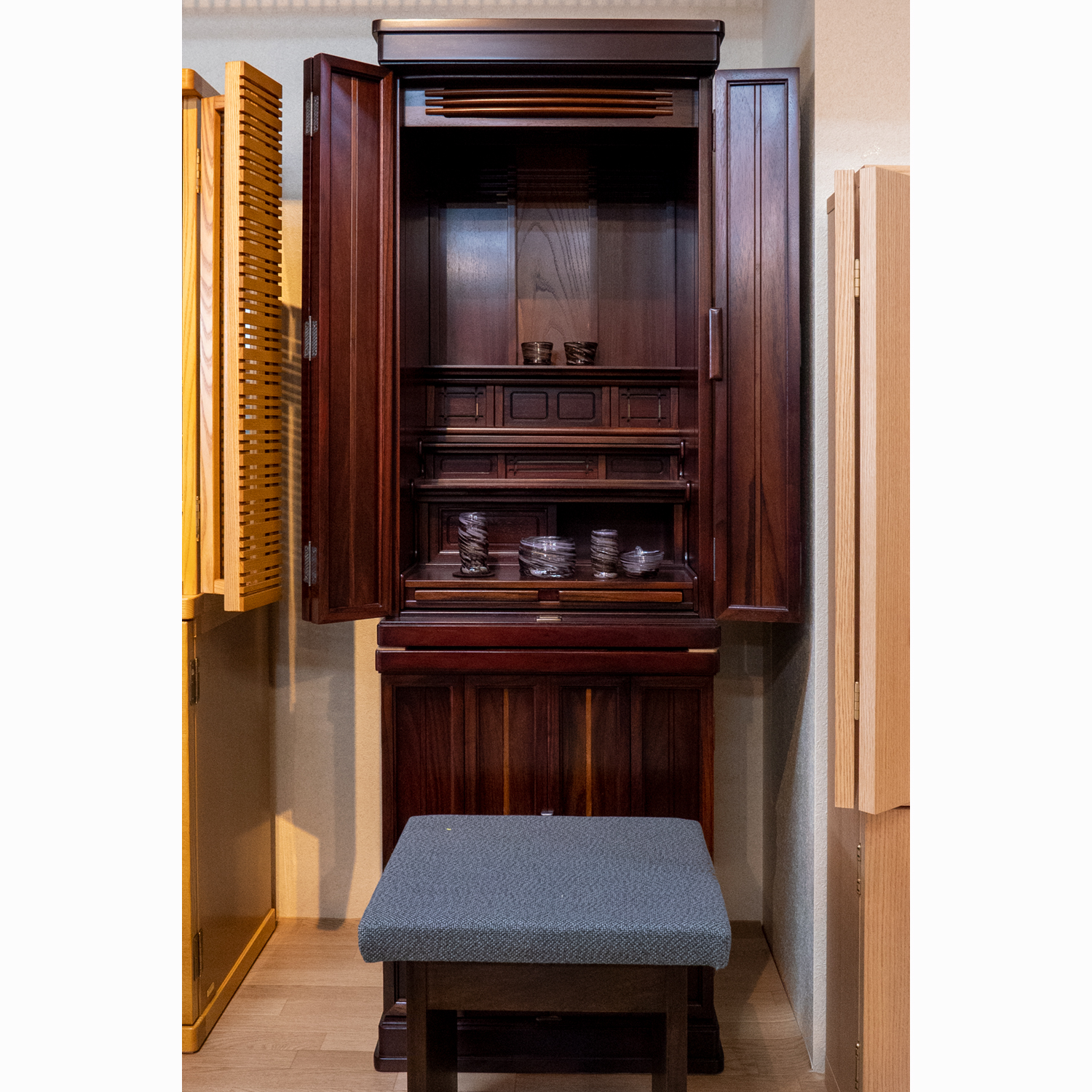唐木仏壇(和花 紫檀 16-48) 2021 6/14 富山店 商品名和花 紫檀 16-48メーカー丸喜(名古屋)価格629,200円(税込み)本体寸法高?cm×幅?cm×奥行?cm仏間寸法3.5〜4尺仏間 ポイント 仏具代は、上記価格に含みません。 唐木仏壇(紫檀調 賛歌 20号) 現代調仏壇(スコラ ウォルナット)