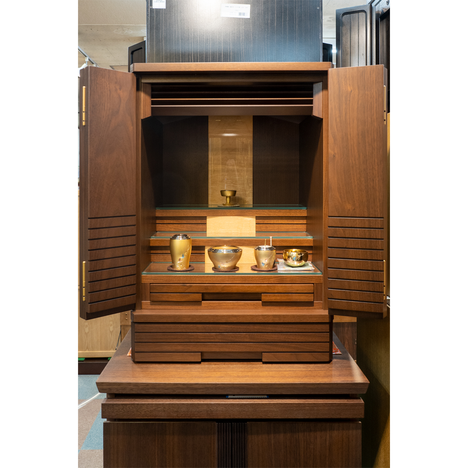 現代調仏壇(フィーノ ウォールナット21-15) 2021 8/21 魚津店 商品名フィーノ ウォールナット21-15メーカー 価格415,800円(税込み)本体寸法 仏間寸法 ポイント 現代調仏壇(桜(カリン市松)13×12) 現代調仏壇(ルリ オーク 25号)