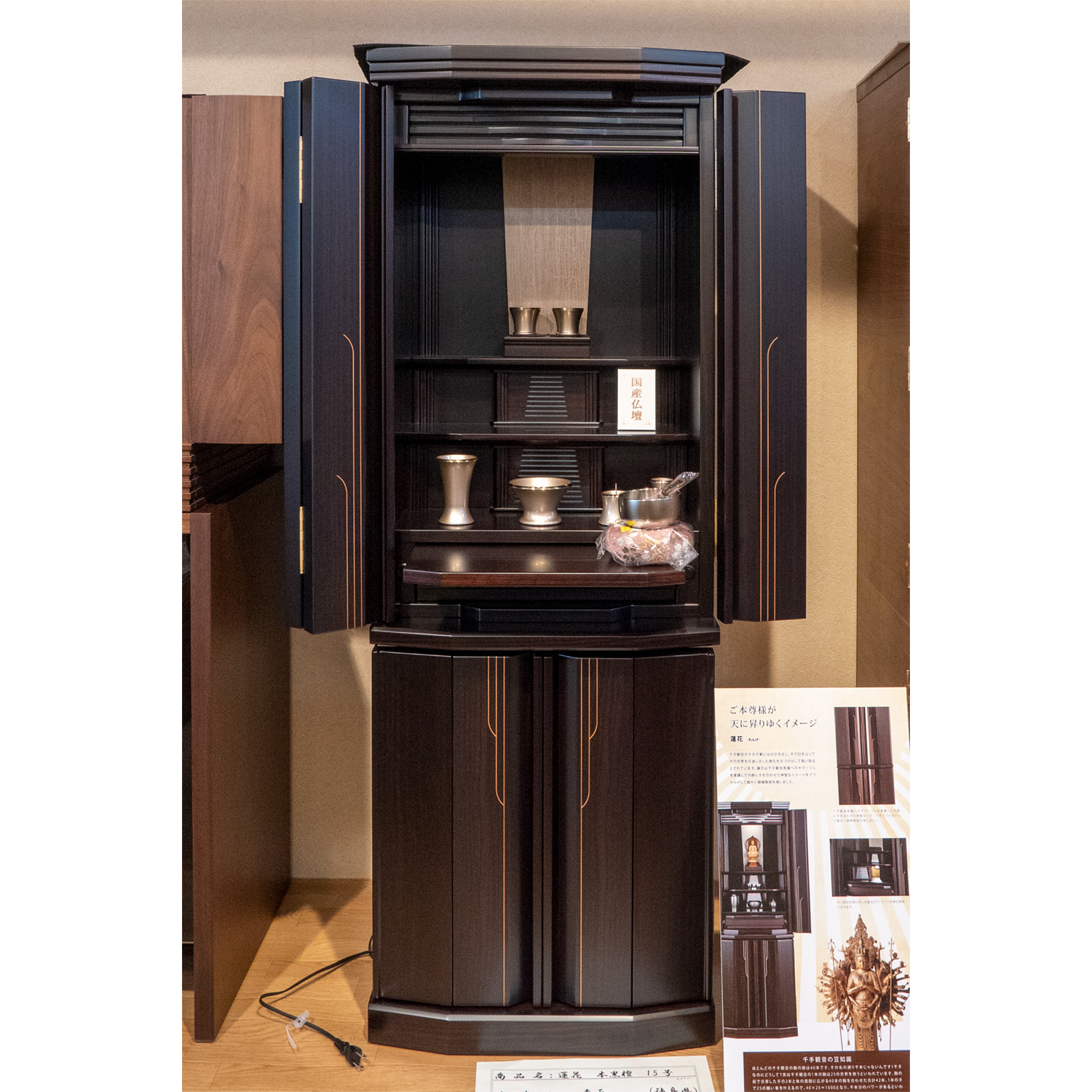 現代調仏壇(蓮花 本黒檀 15号) 2021 6/18 富山店 商品名蓮花 本黒檀 15号メーカー森正(徳島県)価格755,700円(税込み)本体寸法高130cm×幅47cm×奥行43cm仏間寸法?尺仏間 ポイント 仏具代は、上記価格に含みません。 現代調仏壇(ストライプ) 現代調仏壇(美 BUTSUDAN ウォルナット)