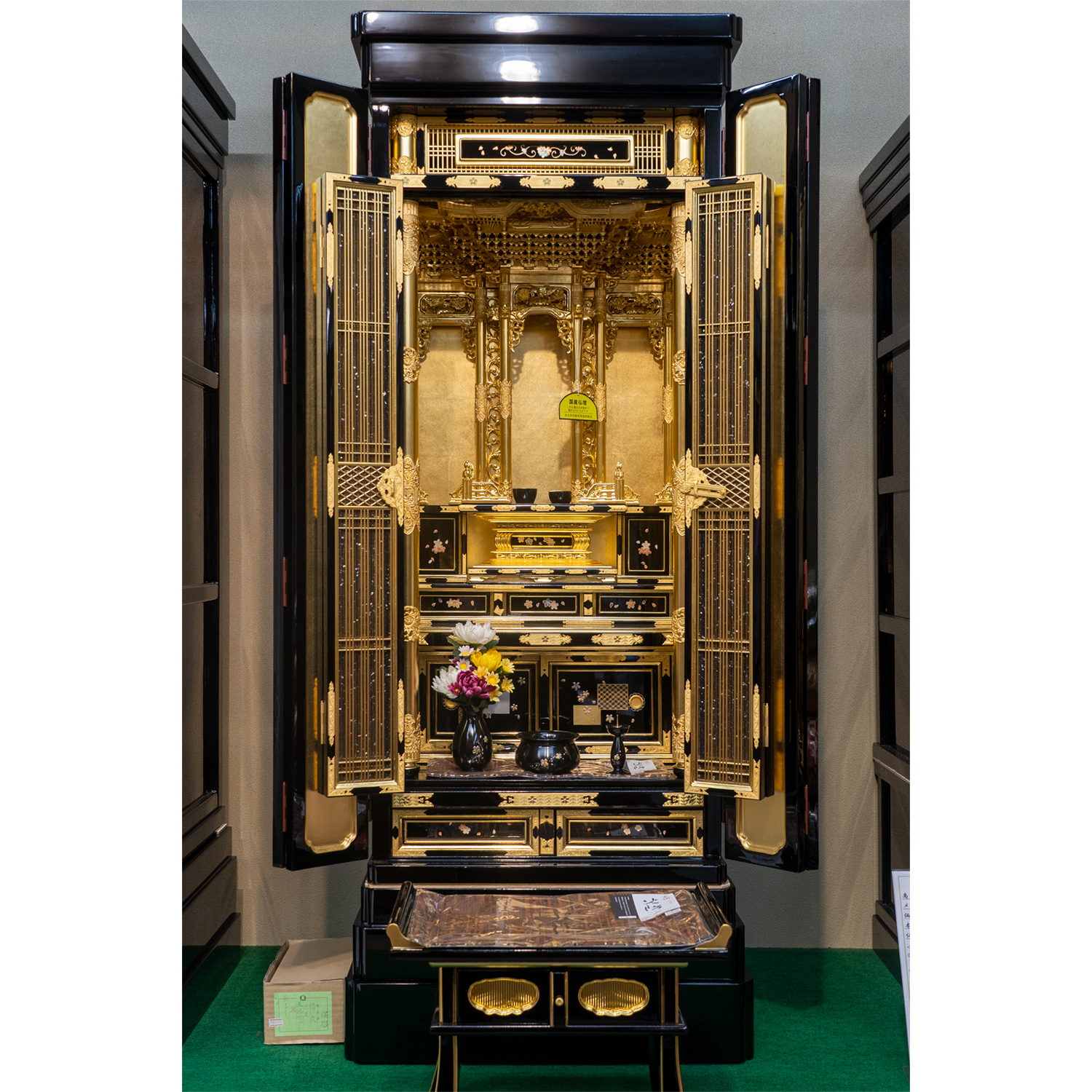 - 黒塗りを基調とし金箔や蒔絵の美しさが引き立つ仏壇です。